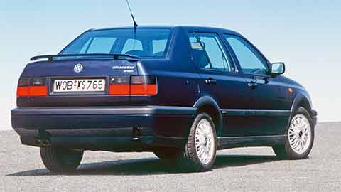 Volkswagen Vento był produkowany w latach 1992 – 1998. Etymologia nazwy jest bardzo prosta – oznacza wiatr. Pierwsza generacja Volkswagena Golfa pojawiła się w salonach w 1974 roku. Pięć lat później producent rozpoczął produkcję Jetty – pozycjonowanej jako osobny model, ale w istocie będącej zmodernizowaną wersją sedan typowego Golfa pierwszej generacji. Druga generacja Jetty była oparta o konstrukcję Golfa 2. Trzecią zbudowano, wykorzystując płytę podłogową i większość elementów, pochodzących z Volkswagena Golfa 3. Tym razem jednak koncern zmienił nazwę auta. I tak narodził się Volkswagen Vento. W Polsce auto kojarzone jest przede wszystkim z radiowozami, albowiem pojazd był masowo wykorzystywany przez polską policję. Używany Volkswagen Vento ma wiele ciekawych elementów, które sprawiały, że w czasach świetności był samochodem atrakcyjnym wizualnie. Charakterystyczne dla tego pojazdu są: prostokątne reflektory przednie, duże, prostokątne tylne lampy oraz migacze i światła mijania, zamontowane w przednim zderzaku. Auto ma zaakcentowane nadkola, charakterystyczne przetłoczenie pod linią okien i plastikowe listwy ochronne, umieszczone w dolnej części drzwi. Pas przedni jest bardziej prostokątny niż w przypadku Golfa 3, pojazd ma także nieco inny grill. Zmieniono również kształt słupka C, którzy jest chudszy niż w bazowej „trójce”. Prostokątny bagażnik zapewnia ogromną ilość miejsca – aż 550 l pojemności. To sprawia, że ten dość leciwy samochód używany bije na głowę wiele współcześnie produkowanych aut. Po złożeniu tylnej kanapy ilość miejsca wzrasta do 885 l pojemności. Używany Volkswagen Vento dostępny jest tylko w jednej, 4-drzwiowej wersji nadwozia. Auto było oferowane w 8 wersjach wyposażenia. To samochód używany, który jest pozycjonowany w autosegmencie C, czyli klasie kompaktowej (średniej niższej).